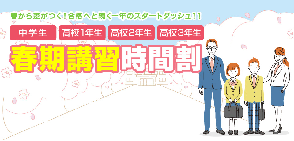春期講習の時間割です。 ※詳細は、pdfファイルをダウンロードしてご確認ください。 中学1年生の時間割PDF n 中学2年生の時間割PDF n 高校1年生の時間割PDF n 高校2年生の時間割PDF n 高校3年生の時間割PDF n